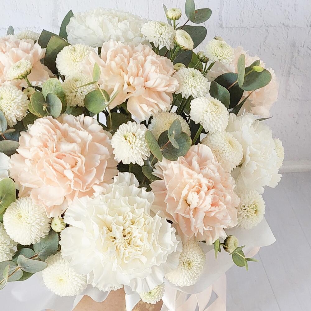 Нежный букет из самых стойких цветов – ажурных сортовых диантусов, эффектной хризантемой Помпон и ароматного эвкалипта.